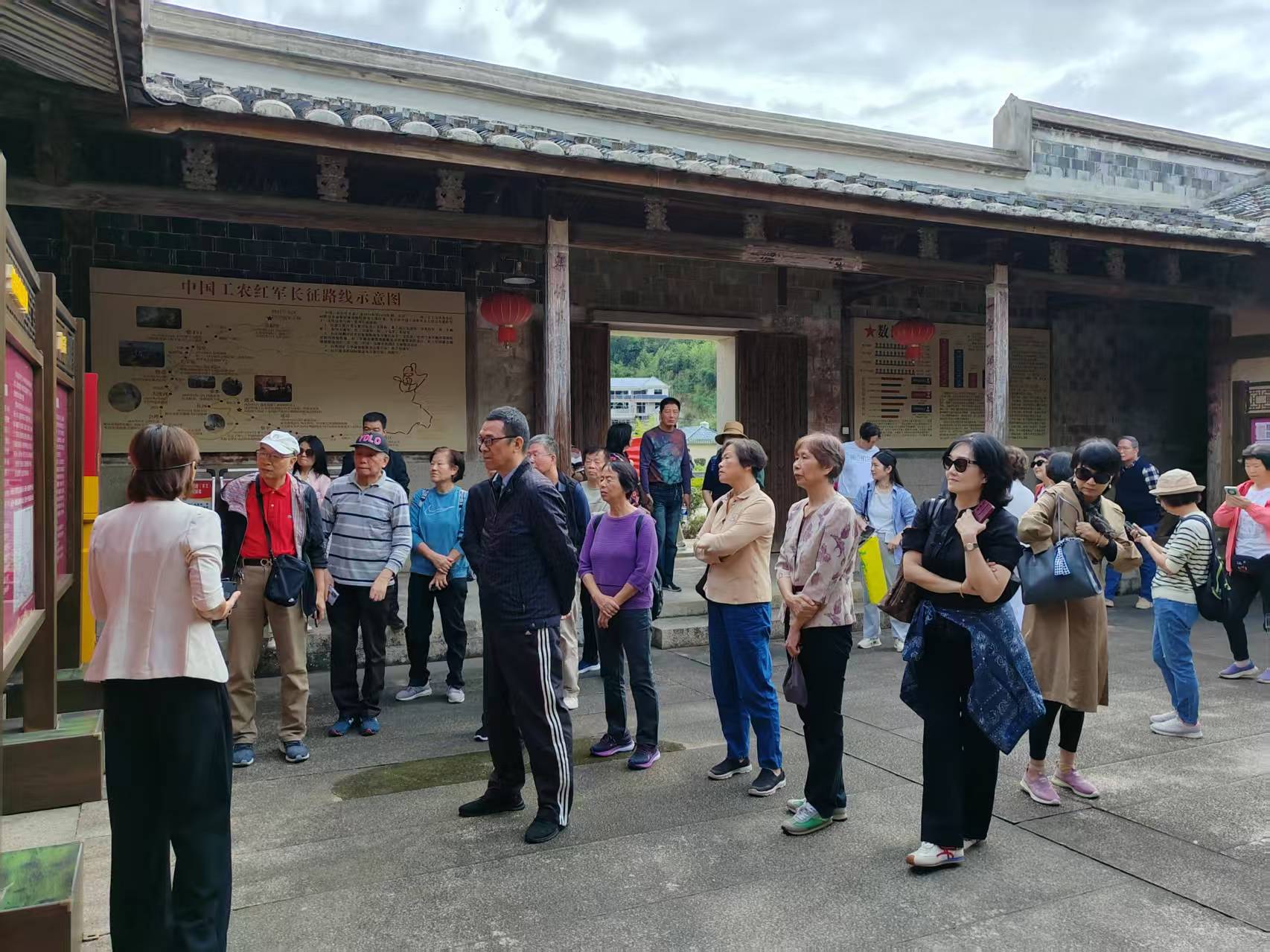 活动首站抵达红色热土百丈村。老同志们怀着崇敬的心情,跟随讲解员参观了革命历史展陈,聆听那段烽火岁月的英勇事迹。斑驳的文物、详实的史料,将大家的思绪带回到激情燃烧的革命年代,深刻感悟先辈们坚定的理想信念与不屈不挠的斗争精神。随后,队伍前往有“建筑化石”之称的三落厝古民居。穿梭于黛瓦相连、布局精巧的明清古建筑群中,老同志们不仅为古人精湛的建筑技艺赞叹,更通过古今对比,切身感受到了在党的领导下,乡村面貌发生的翻天覆地变化与文旅融合发展的蓬勃生机。