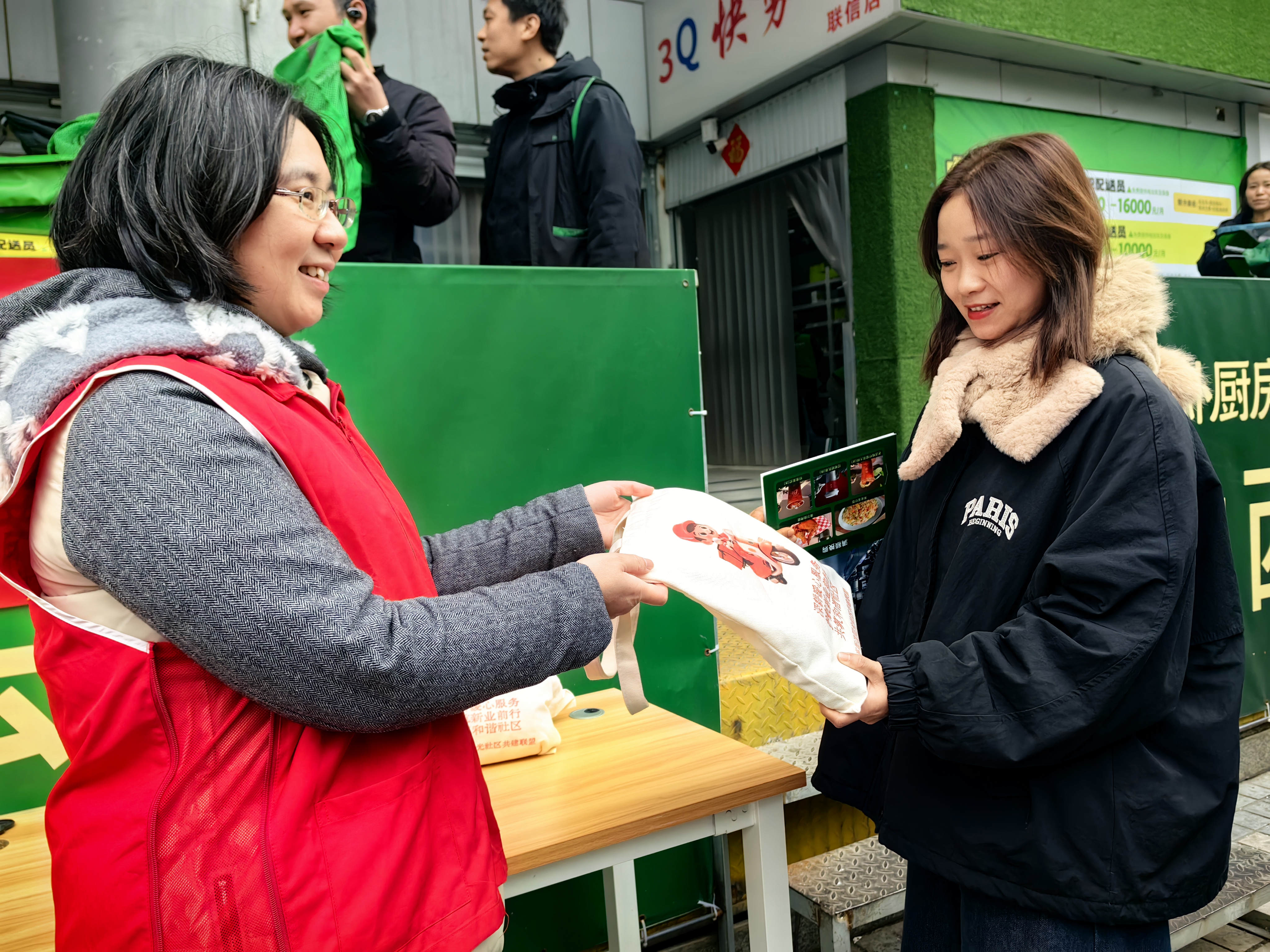 除了美味的元宵,社区还联合13家共建单位精心定制了“加油暖心包”,内含毛巾、水杯、雨伞等实用物资,为新就业群体提供一份实实在在的便利与支持。“太实用了,谢谢你们!”志愿者送上礼包,收获连声感谢。新就业群体纷纷表示这份关怀让他们倍感振奋、更有干劲。